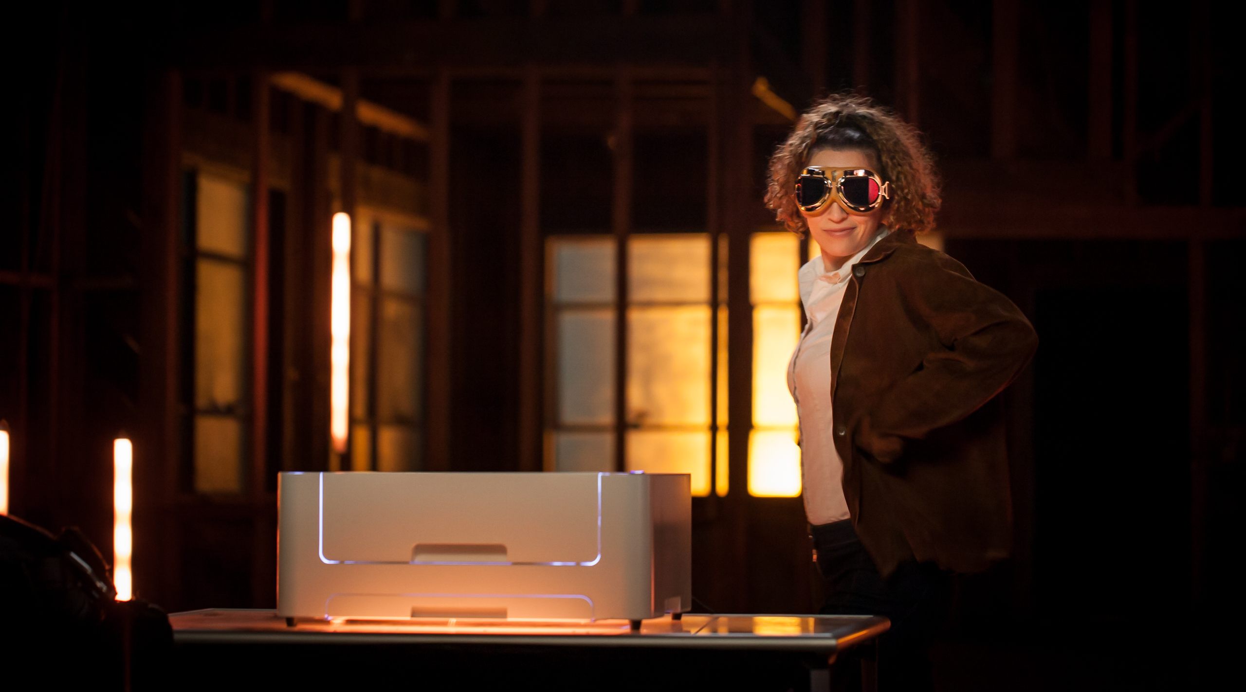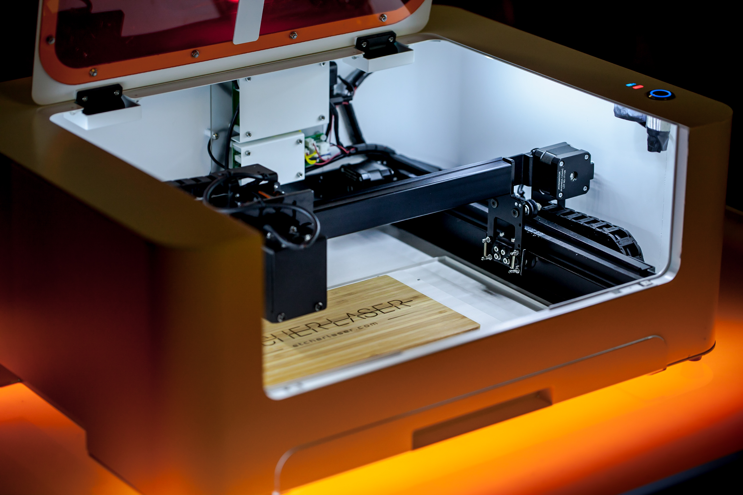 “Pew Pew”. The industrial switch is thrown. The warehouse windows light up, one after another, cascading towards center. The spotlight punches on, debuting the brand new laser etcher…