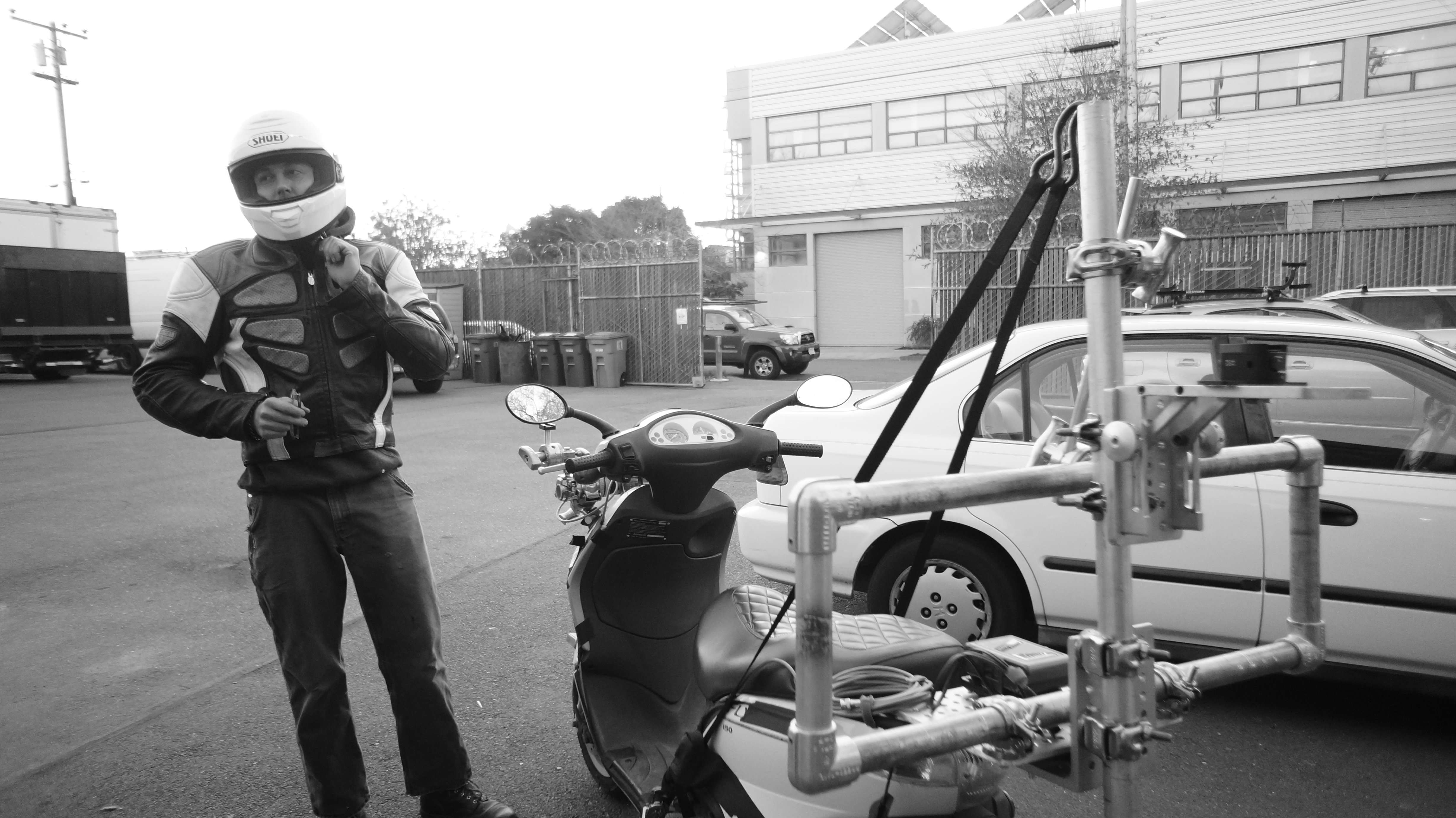 The wind howled. Chilled the bone. But the cast and crew rode on through the empty streets. A clever camera rig, mounted to a Vespa scooter, with a remote operator in a trail car shoots up at the cyclists. Her arms take flight. An enormous natural smile, riding hands free for the first time in her life…