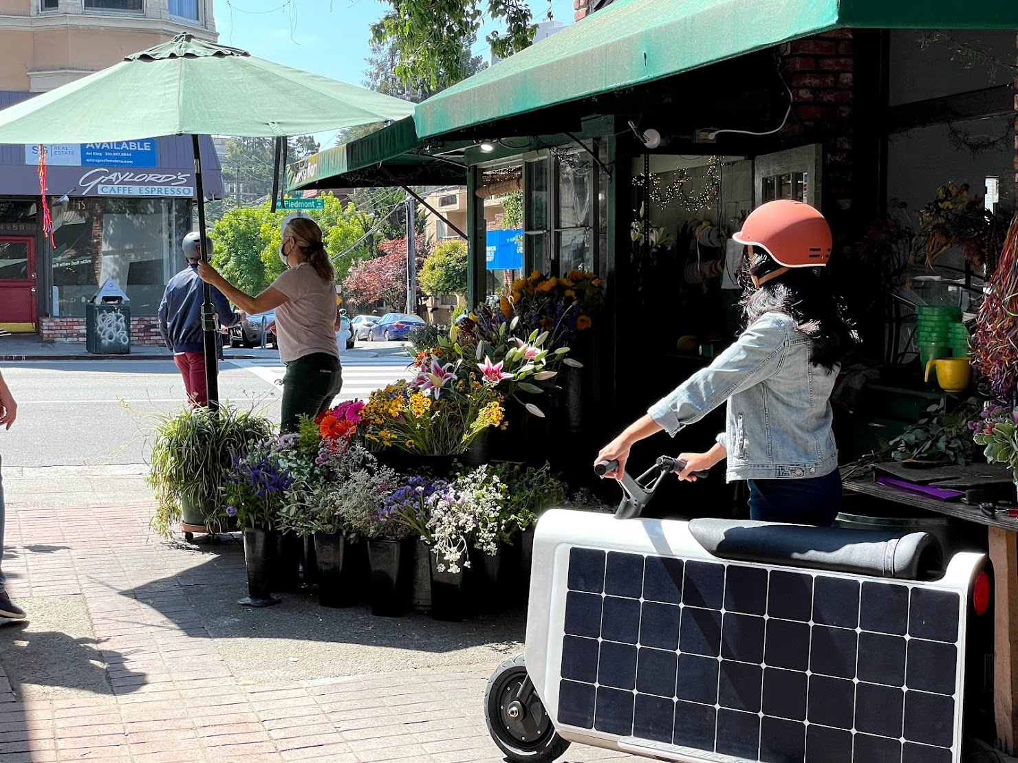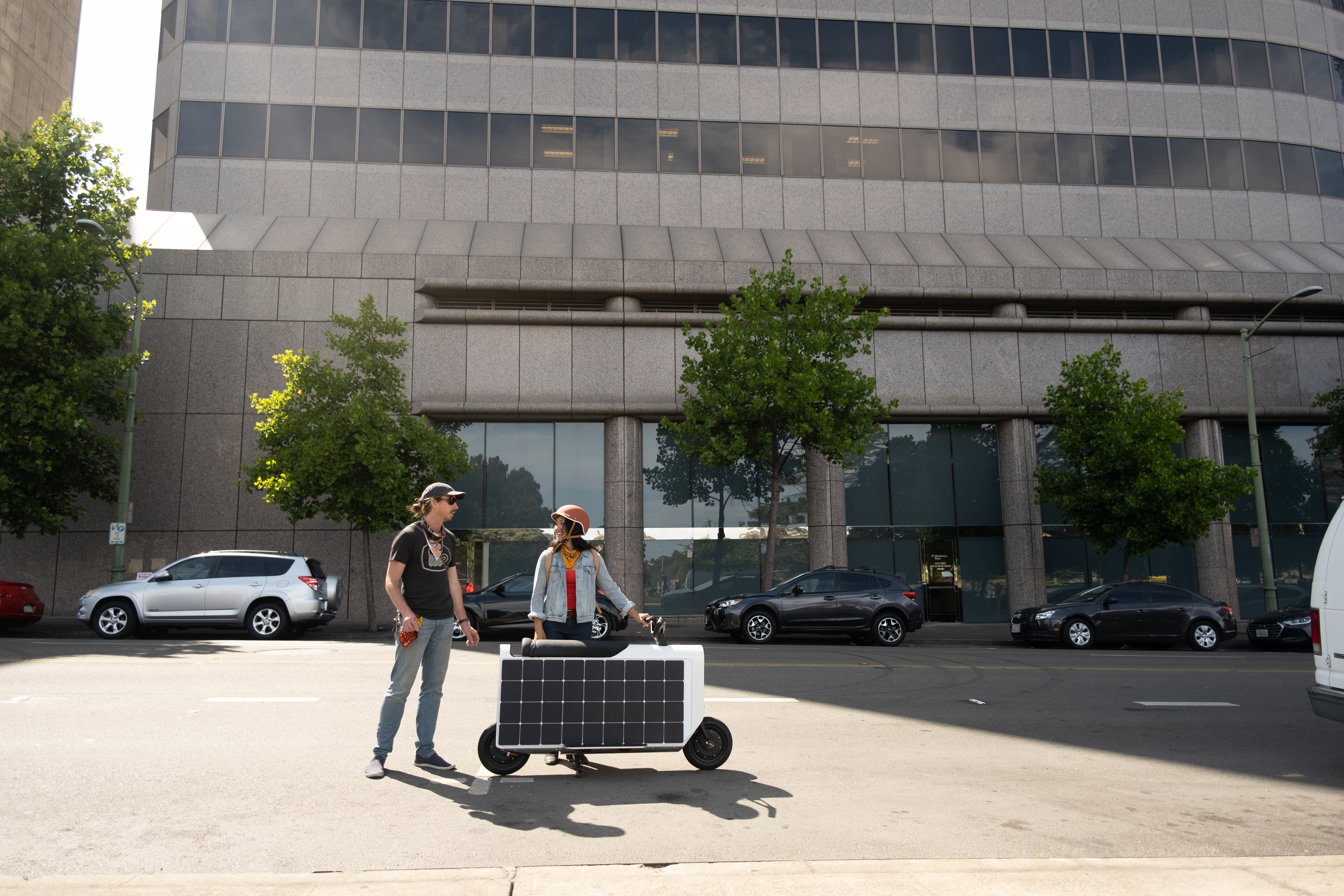 The shadows slide up the scooter, sun scraping across the solar panels. Their legs go over. The throttle twists. Wind blows their hair. A scamper through the city on rolling sunshine, smiles all the way.